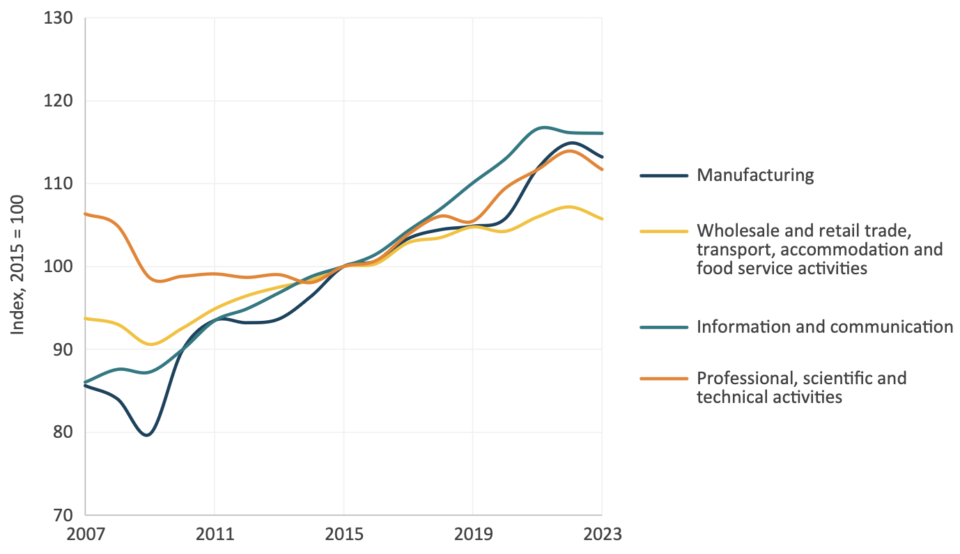 Since 2015, labour productivity growth in information and communication (ICT) services has outpaced that of the manufacturing sector. On average, value added per hour worked increased by 1.9 per cent in the information and communication services sector, compared to 1.6 percent in manufacturing. Labour productivity in professional, scientific, and technical services first declined on average by 0.8 per cent between 2007 and 2015, before rebounding to an average annual growth rate of 1.41 per cent between 2015 and 2023. Both types of sectors are important knowledge-intensive domains and therefore exhibit higher productivity levels. In contrast, the wholesale and retail, transportation, and accommodation and food service sectors have exhibited slower labour productivity growth than manufacturing since 2015, averaging just 0.7 percent per year.