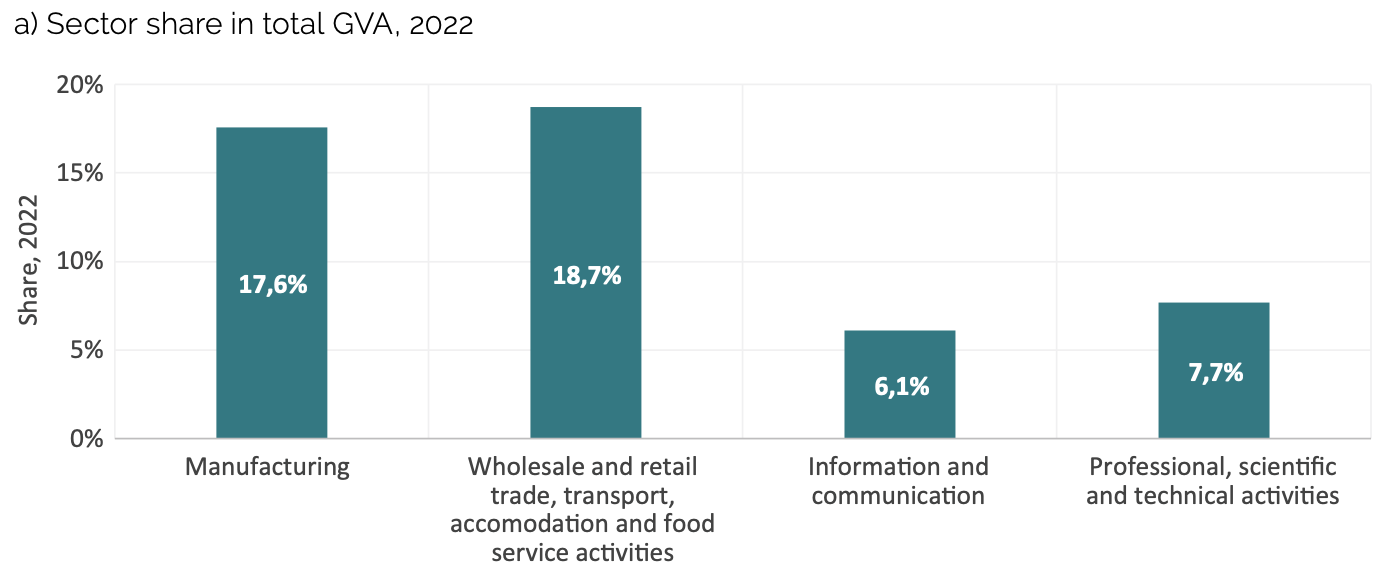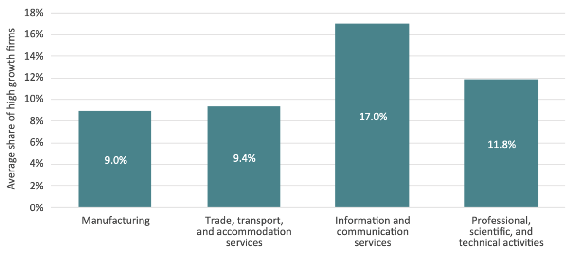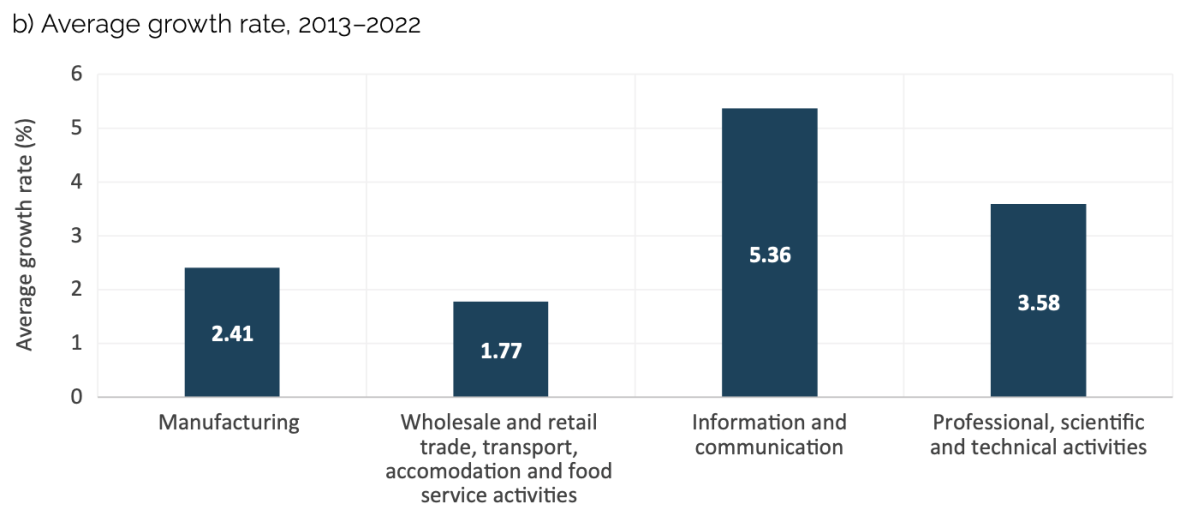 As a result, the greater level of firm and employment dynamism in services also translates into a higher proportion of high-growth firms, which can be seen in Figure 5. Young, high-growth firms are especially important in the economy, as they consistently achieve greater returns on R&D, thereby driving innovation, accelerating technological adoption, and contributing more broadly to productivity gains and economic growth in the long-run. Measured by employment growth exceeding 10 percent annually, high-growth firms in information and communication services accounted for an average of 17 percent of all firms between 2014-2022, followed by professional, scientific, and technical services of almost 12 percent, then trade and transport services of 9.4 percent. Manufacturing shows the lowest share of 9 percent.