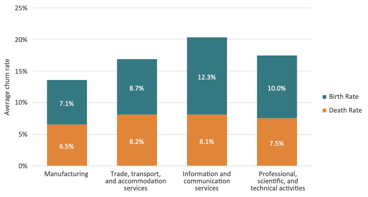 Another key indicator of economic development is the level of creative destruction, or more technically, business dynamism, which measures the market’s capacity to reallocate capital and labour from less to more productive firms. To measure this dynamism, a useful proxy is the churn rate of a sector, which is defined as the combined rate of firm entry (birth rate) and exit (death rate). The processes of business creation and closure are vital, as they reflect the mechanism of creative destruction, through which inefficient firms are replaced by newer, more productive entrants. This dynamic is a crucial driver of productivity growth. In well-functioning markets, resources such as labour and capital are reallocated away from underperforming firms and towards those that are more efficient.15