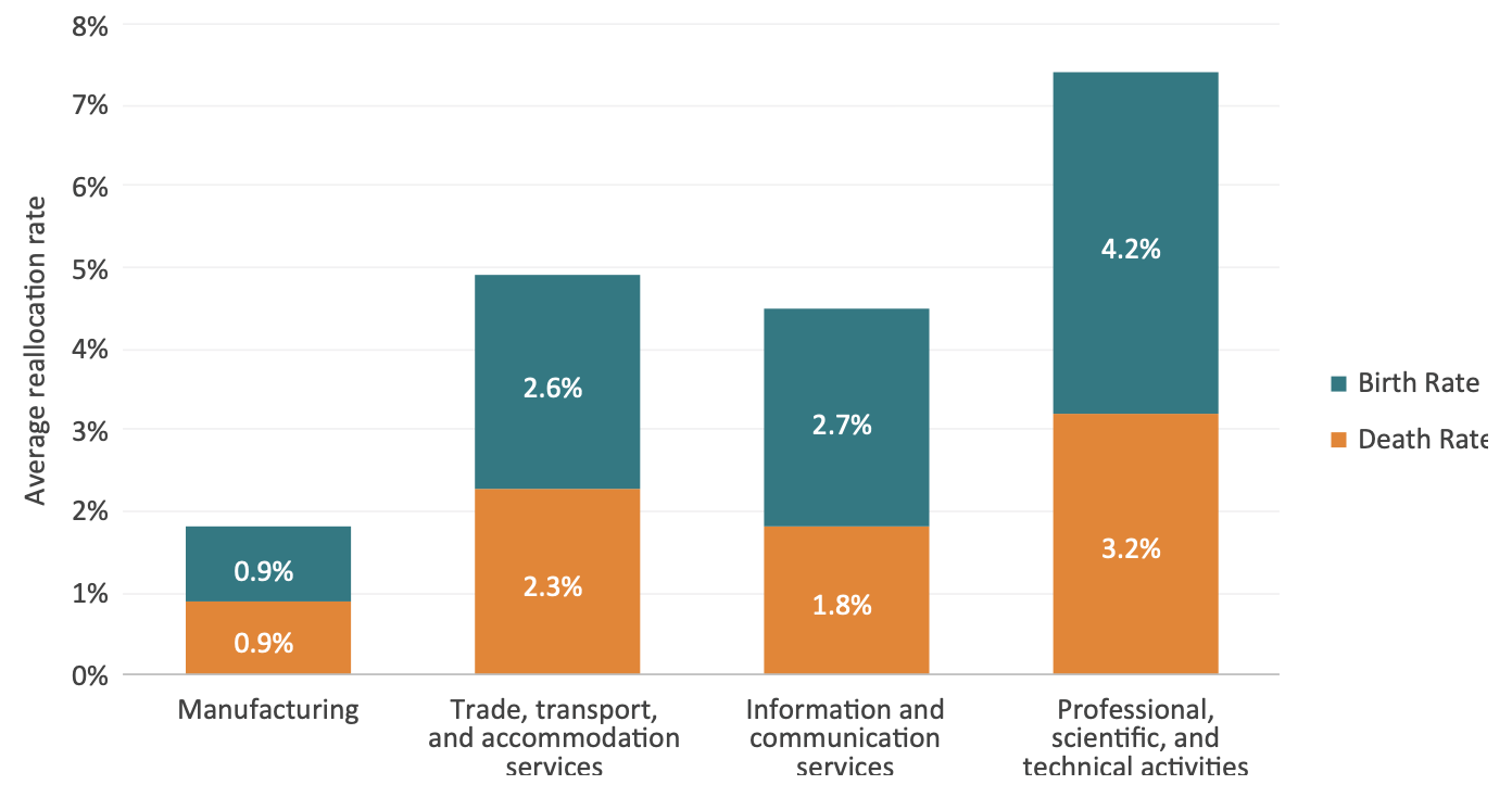 Figure 4 presents a similar analysis, focusing on employment dynamism linked to firm entry and exit. The employment birth (or death) rate measures the number of employees in newly established (or exiting) enterprises as a proportion of total employment in the sector. More technically, it captures changes in employment reallocation rather than firm dynamics. The figure shows that services exhibit a higher employment dynamism than manufacturing. Professional, scientific, and technical services have the highest labour market dynamism at 7.4 percent, followed by trade, transportation and hospitality services at 4.9 percent and information and communication services at 4.5 percent. In contrast, manufacturing lags significantly behind at just 1.8 percent, indicating relative stagnation in workforce turnover.