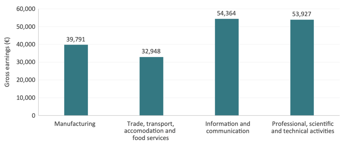 Beyond productivity, growth rates, and business dynamism, another myth to dispel is the notion that manufacturing jobs inherently offer better wages than service activities. Figure 6 illustrates that average earnings are higher in the global innovators compared to both the manufacturing sector and trade, transport and accommodation services. Specifically, gross earnings, which encompass wages and salaries paid to employees before tax and deductions, are significantly higher in information and communication services than in manufacturing. The earnings gap between professional services and manufacturing also substantial. This wage disparity partly reflects the higher labour productivity observed in these sectors over the past decade.