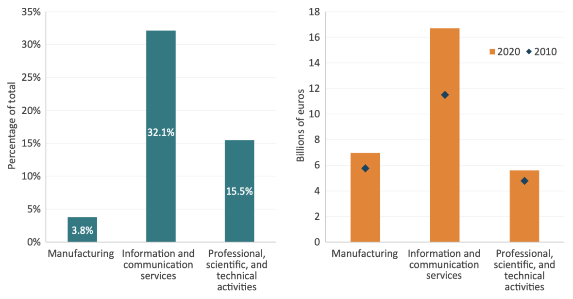 FIGURE 7A AND 7B: ICT EQUIPMENT INVESTMENT BY SECTOR FOR 10 EU COUNTRIES AS A SHARE OF NON-RESIDENTIAL INVESTMENT (LEFT, 2010–2020 AVERAGE) AND IN BILLION EUROS (RIGHT, 2010 AND 2020)