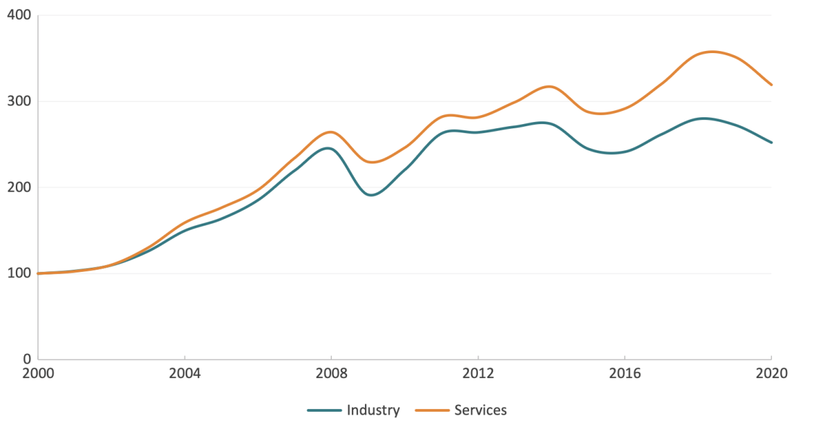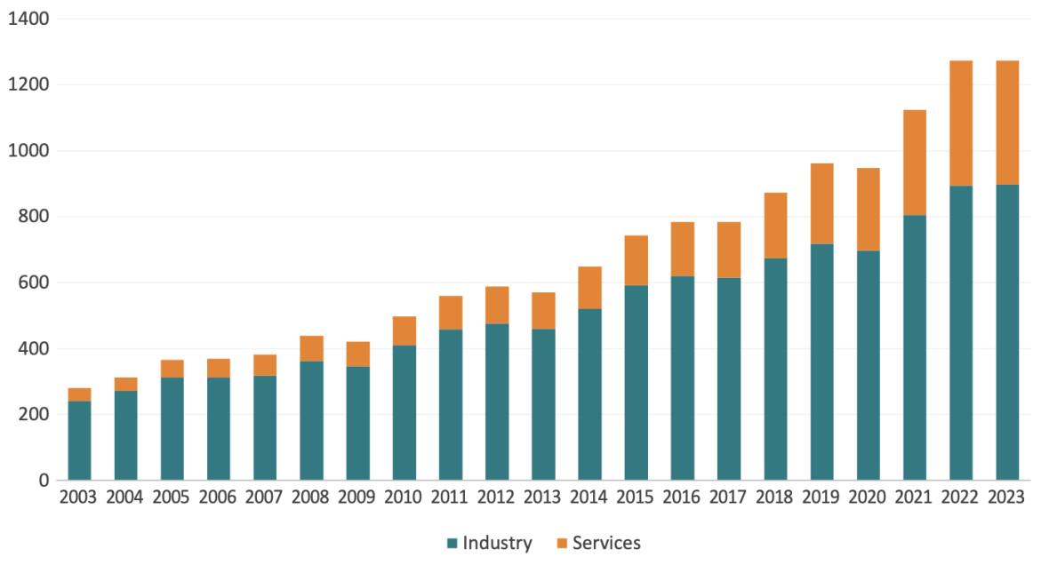 Figure 8 illustrates the evolution of global business R&D spending in the industry and services sectors from 2003 to 2023. The first key observation is that privately funded R&D expenditure has increased significantly worldwide over the past two decades, even when adjusted for inflation.