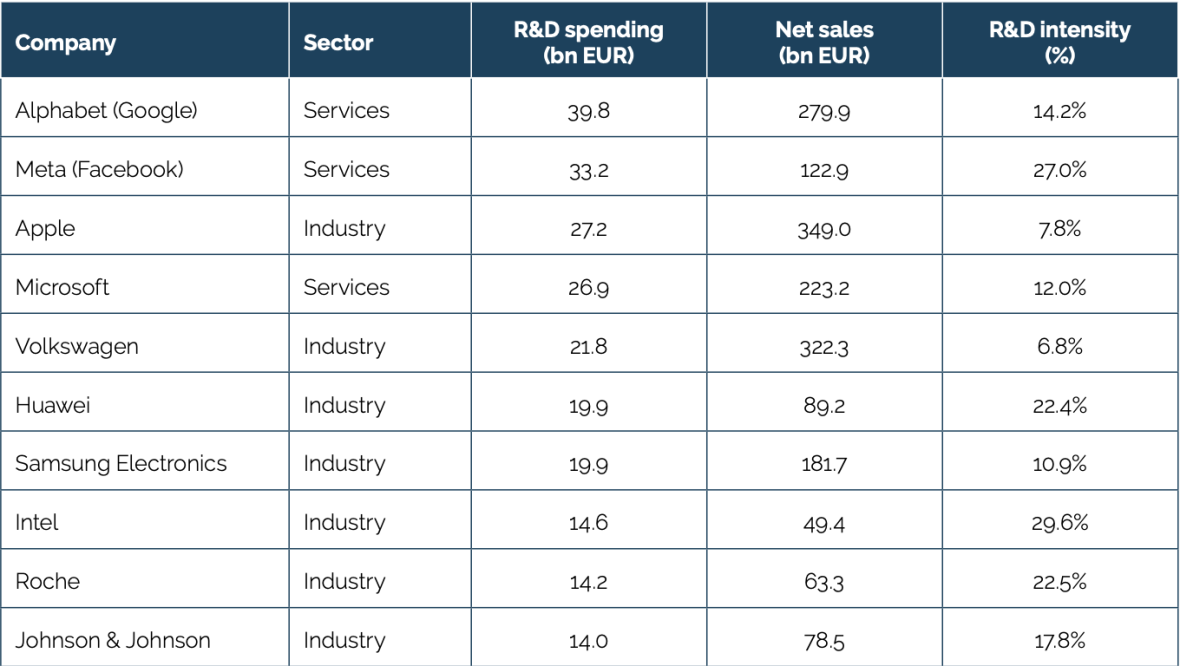 The significance of the service sector as a source of R&D and new innovations is evident even when shifting focus from aggregate trends to firm-level data. Many services firms often exhibit higher R&D intensity than manufacturing firms. For example, Table 1 presents the top 10 companies worldwide by R&D expenditure in 2023. Notably, three of the ten largest R&D spenders, all placed in the top 5, are services firms, collectively investing approximately EUR 100 billion in R&D. This figure is not far behind the EUR 132 billion devoted to R&D by the remaining seven industrial firms.