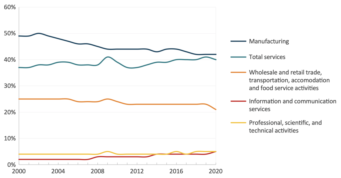Moreover, many services activities also carry higher levels of value-added when exported. The trend shown in the previous Figure 10 typically captures gross trade in services. Many goods and services cross borders multiple times, risking inflating this gross measure of trade. Using trade in value-added data nets out this double counting and measures the contribution of domestic value added in trade. Figure 11 shows that on this metric, services have now converged to that of the manufacturing sector. Both sectors currently contribute approximately 40 percent domestically to total gross exports. At the same time, the domestic share of value added from manufacturing has declined markedly, falling from 49 percent in 2000 to 42 percent in 2020.