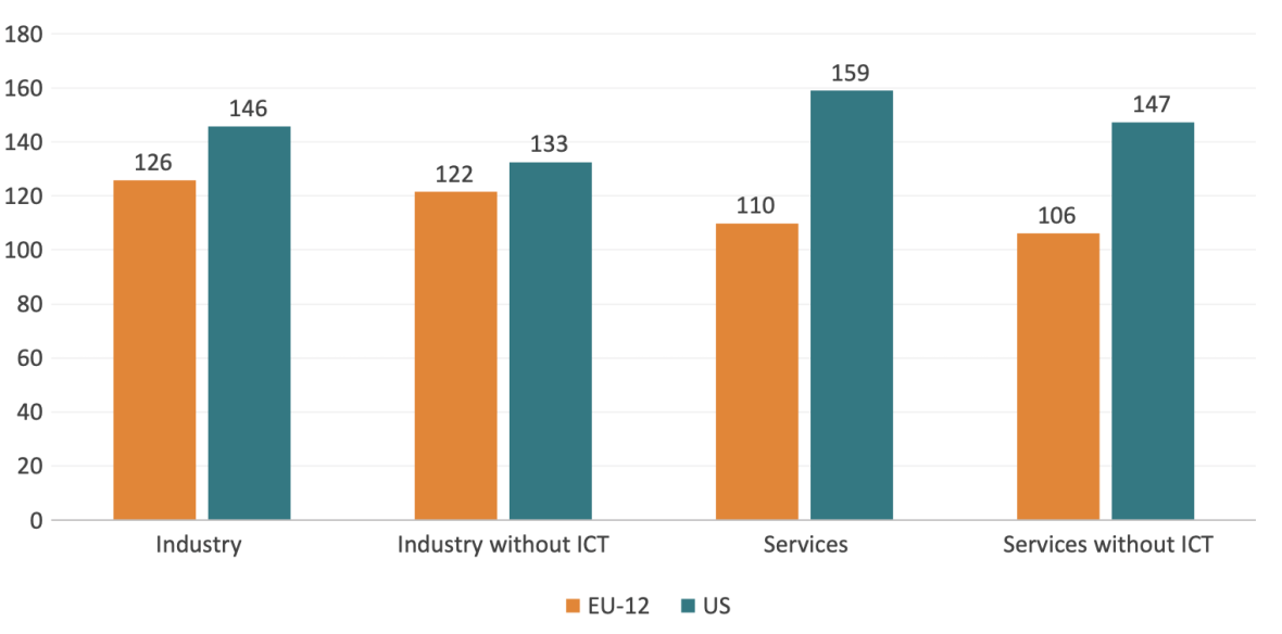 Draghi’s observations are not merely assertions; they are clearly reflected in the data. Figure 12 illustrates hourly labour productivity for the EU-12 and the US in 2021, expressed as a multiple of 2001 by setting this year to 100. The figure clearly shows that the greatest productivity growth has occurred in the US services sector, especially when including ICT. In contrast, the EU has seen the bulk of its productivity growth in industry, although still at a slower pace than the US.
