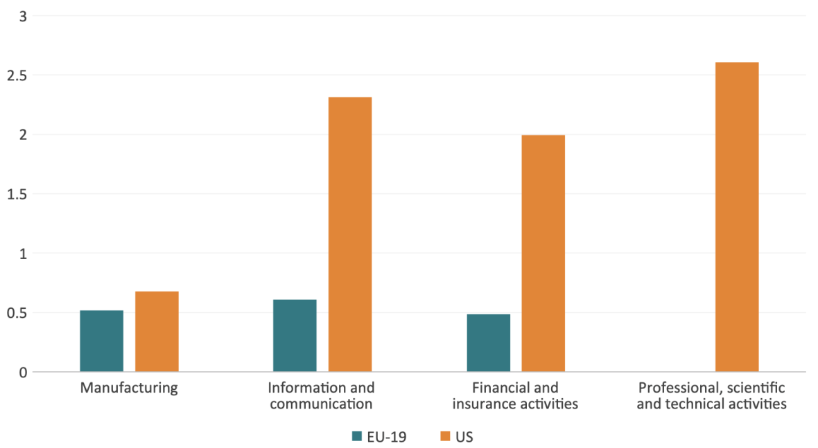 Source: ECIPE calculations based on EUKLEMS & INTANProd data. Data for Professional, scientific and technical activities is missing at the EU level.