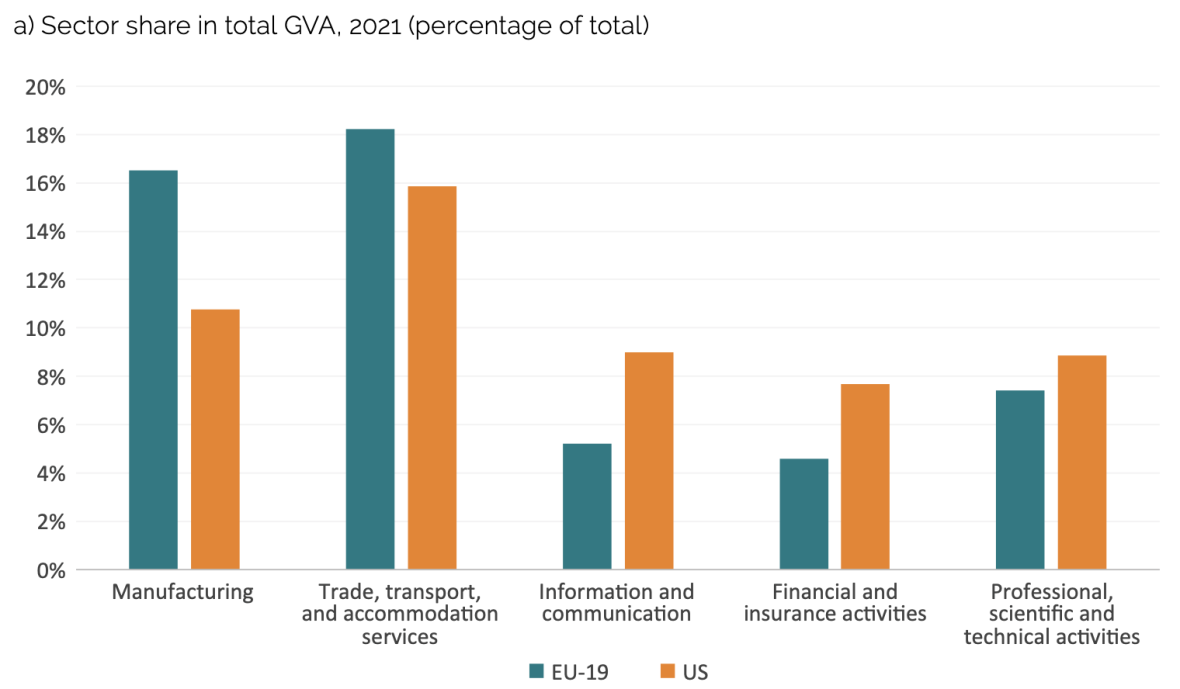 Perhaps the most compelling piece of evidence on the EU’s failure to keep pace with the US in services, and which causes to be the primary factor in the widening transatlantic productivity divide, is Mario Draghi’s report on The Future of European Competitiveness. In this report, Draghi highlights how the EU’s gap in aggregate labour productivity relative to the US is largely the result of the Union experiencing significantly less activity in the sectors where the bulk of productivity growth has occurred, particularly in ICT and digital services.31