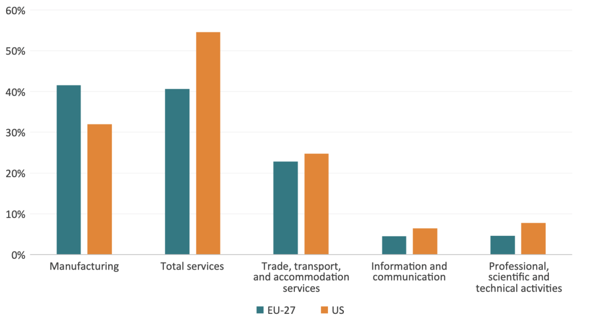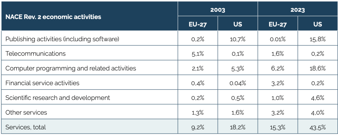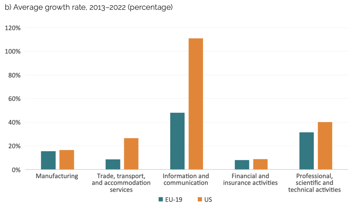 Now that we have established that the bulk of the productivity and value-added growth disparity between the EU and the US lies in services, the natural next step is to explore its underlying causes. As the Section 2 explained, productivity advances are closely tied to firm investments in new digital technologies, R&D and innovation, and intangible capital, especially for services.