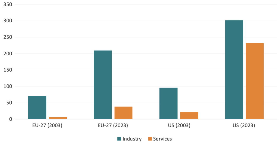 To answer this, we use data from the EU Industrial R&D Investment Scoreboard,38 which tracks privately funded business R&D spending from 2003 to 2023 for the world’s top corporate spenders, covering 80-90 percent of global R&D expenditures. Figure 15 presents inflation-adjusted corporate R&D spending (in billions of euros) for EU and US industry and services companies in 2003 and 2023. The figure shows that the differences between these two periods across the EU and the US are striking, particularly for services.
