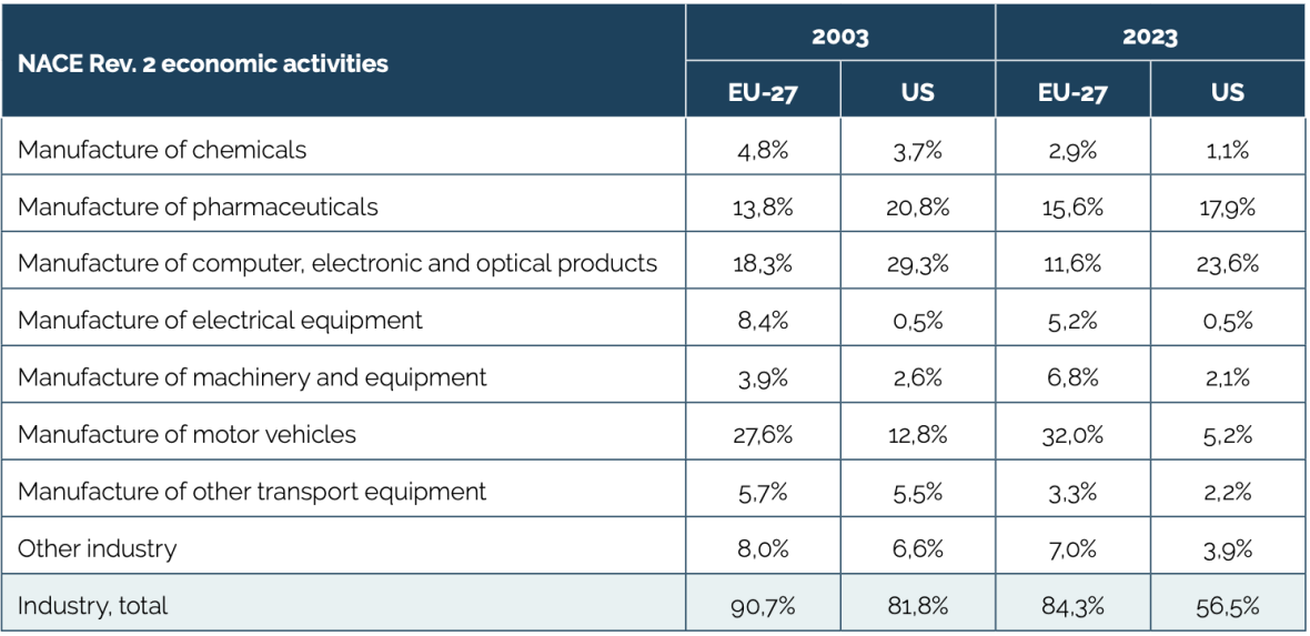 Chapter 3 will compare productivity trends in the service sectors between the EU and the US on similarly productivity, value-added, and trade. It therefore positions this comparison as a central factor in explaining the broader performance gap between the two regions, which is particularly related to innovation. The core argument is that Europe’s lag in service-sector performance is a primary contributor to the widening transatlantic productivity divide.