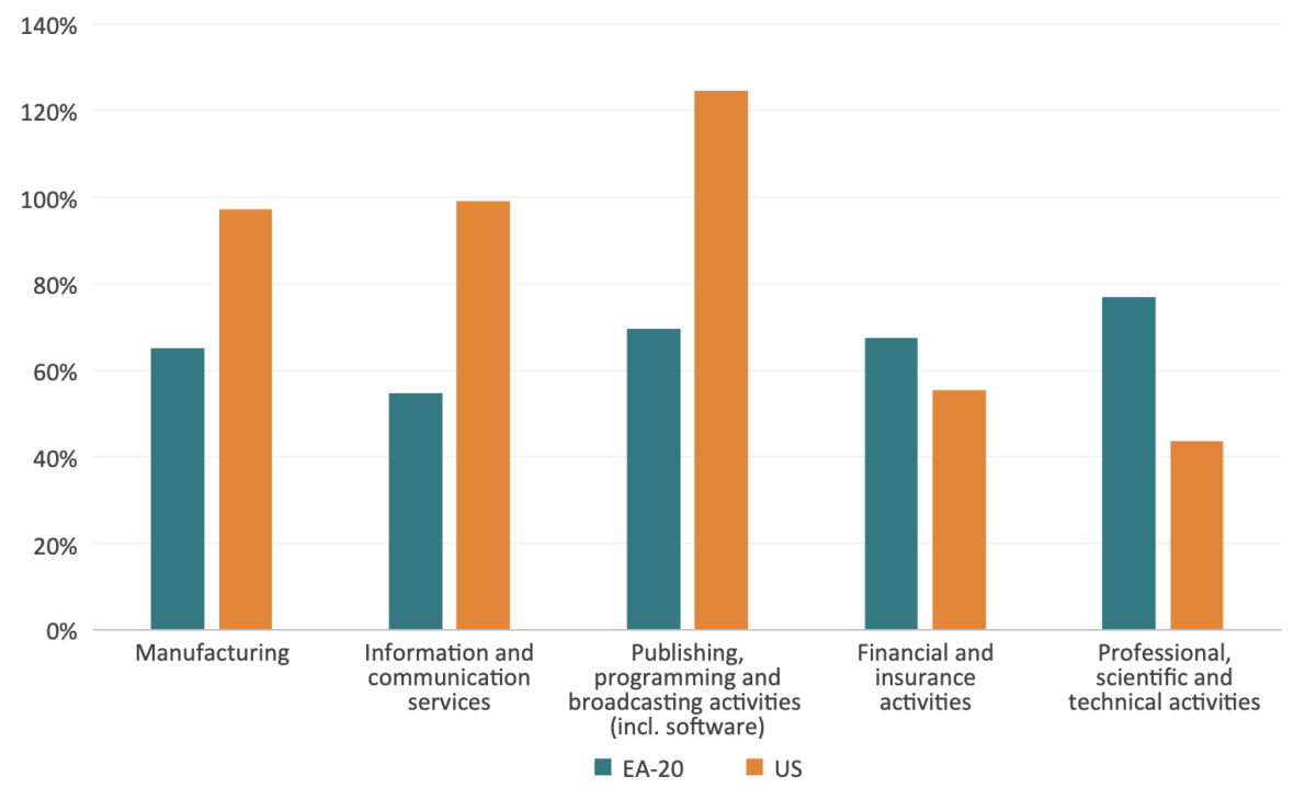 Source: ECIPE calculations based on EUKLEMS & INTANProd data.26 Note: Euro area countries include Austria, Belgium, Croatia, Cyprus, Estonia, Finland, France, Germany, Greece, Ireland, Italy, Latvia, Lithuania, Luxembourg, Malta, the Netherlands, Portugal, Slovakia, Slovenia and Spain.