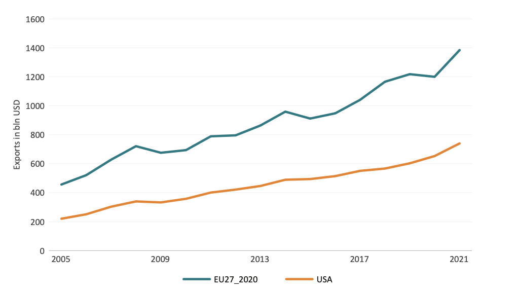 Another notable trend related to Figure 11 is the steady increase in domestic value added from information and communication services and professional activities. In fact, the domestic contribution of value-added in exports has now exceeded that of the computer and electrical equipment manufacturing sector. Moreover, both services sectors contribute to total services value-added in exports to an almost similar amount. The shift of these examples underscores the growing significance of services as driving forces of EU exports and global trade competitiveness more broadly.29