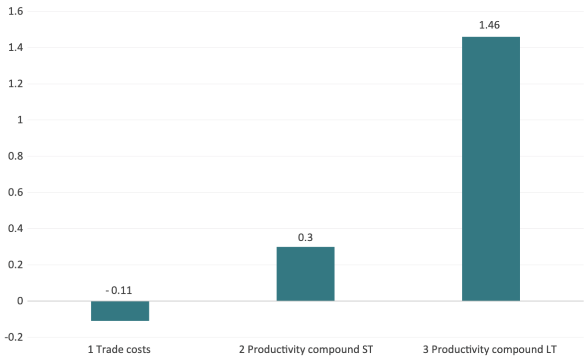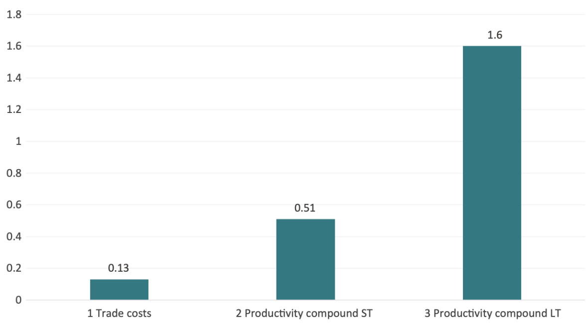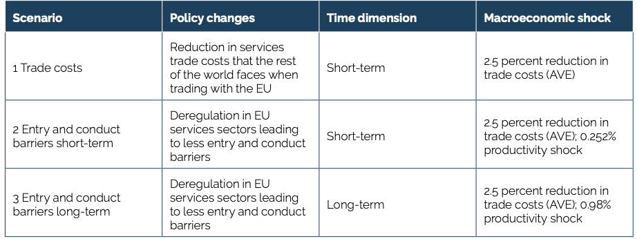 Overall, we simulated 3 different scenarios. Scenario 1 covers a reduction in services trade costs that the rest of the world faces when trading with the EU in the form of a 2.5% trade cost ad valorem equivalent (AVE) following the recent work by the IMF.45 The additional 2 scenarios assume a reduction in services trade costs as well as productivity increases in EU services sectors based on regulatory policies in the form of reduction of regulatory entry and conduct barriers, based on productivity coefficients.46 It is assumed, therefore, that this reduction in regulatory policies has a direct impact on the ability to services sectors to become more productive which happens through better use of resource inputs, value-added creation, as well as investments in ICT, R&D and intangibles, as we have seen above.