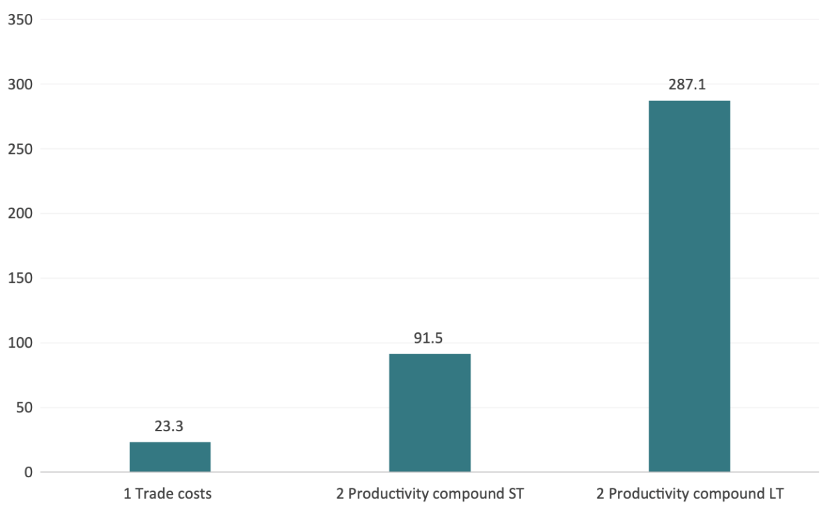 Considering an annual EU GDP of EUR 17.95 trillion in 2024, the trade costs scenario alone is estimated to result in gains of more than EUR 23 billion.49 Similarly, the long-term productivity scenario compounding both entry and conduct barrier reduction accounts for more than EUR 287 billion EUR. Estimated short-term gains for scenario 2 are relatively lower in comparison (see Figure 22).