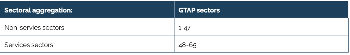 As concerns the economic base data on which we run the simulations, we apply the most up-to-date GTAP 11 database released in 2023. The database contains global trade data for 2004, 2007, 2011, 2014 and 2017 as reference years based on input output tables and recorded trade protection data.54 The database covers 141 countries and 19 aggregate regions of the world for each reference year. The sectoral coverage includes a total of 65 sectors. The GTAP 11 dataset on the global economy was extrapolated to reflect the “best estimate” of the global economy today.