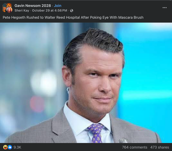 A rumor that U.S. Defense Secretary Pete Hegseth was rushed to Walter Reed Medical Center in Washington, D.C., after poking his eye with a mascara brush circulated online in late 2025. For example, a Facebook page titled Gavin Newsom 2028 shared the story on Oct. 29, 2025 (archived):