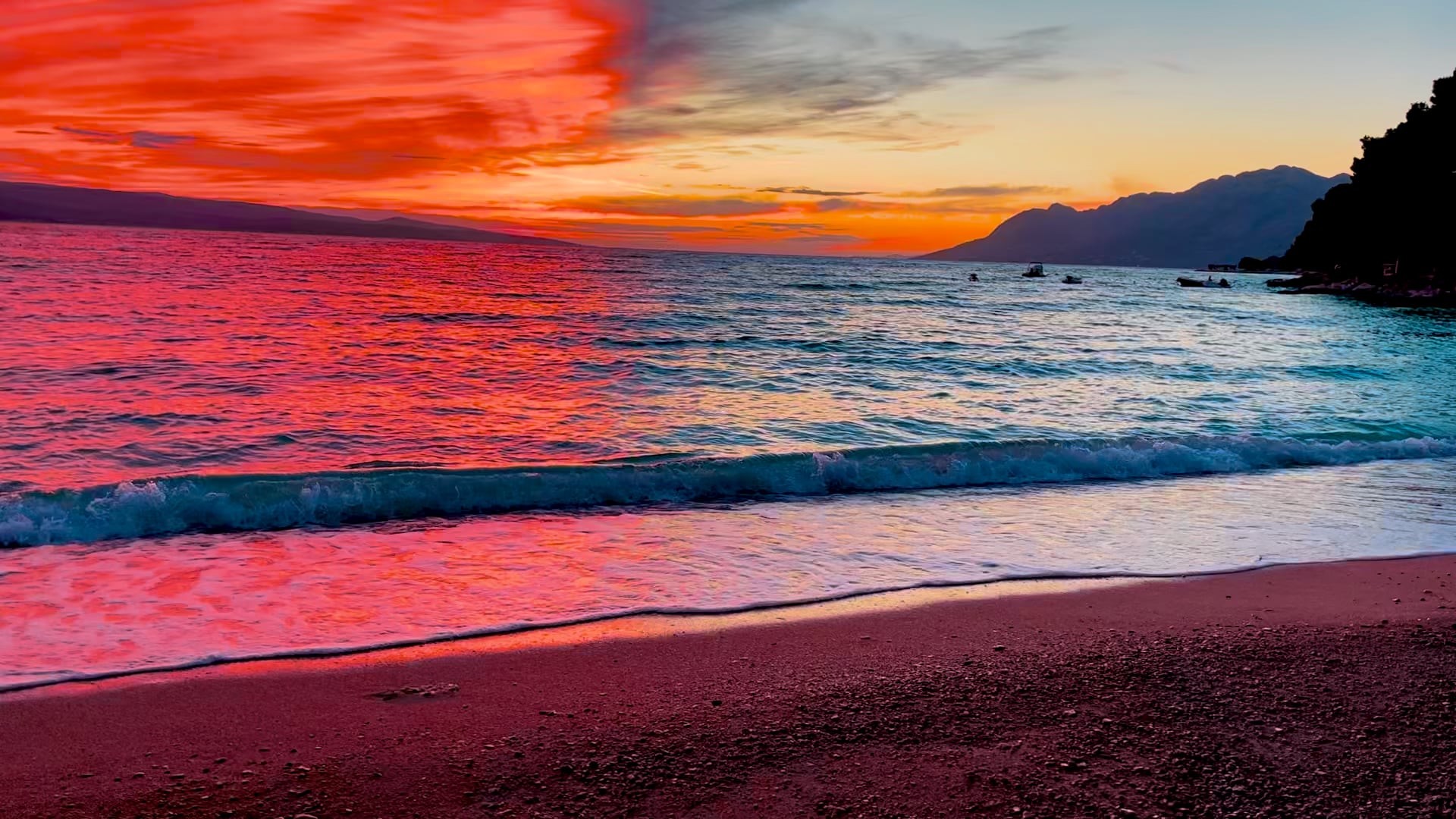 I found this old video I recorded while walking along the beach in Brela a few years back. The sky looked completely unreal. One side was glowing deep red from the sunset and the other side stayed bright blue. It looked like two different skies meeting in the middle.