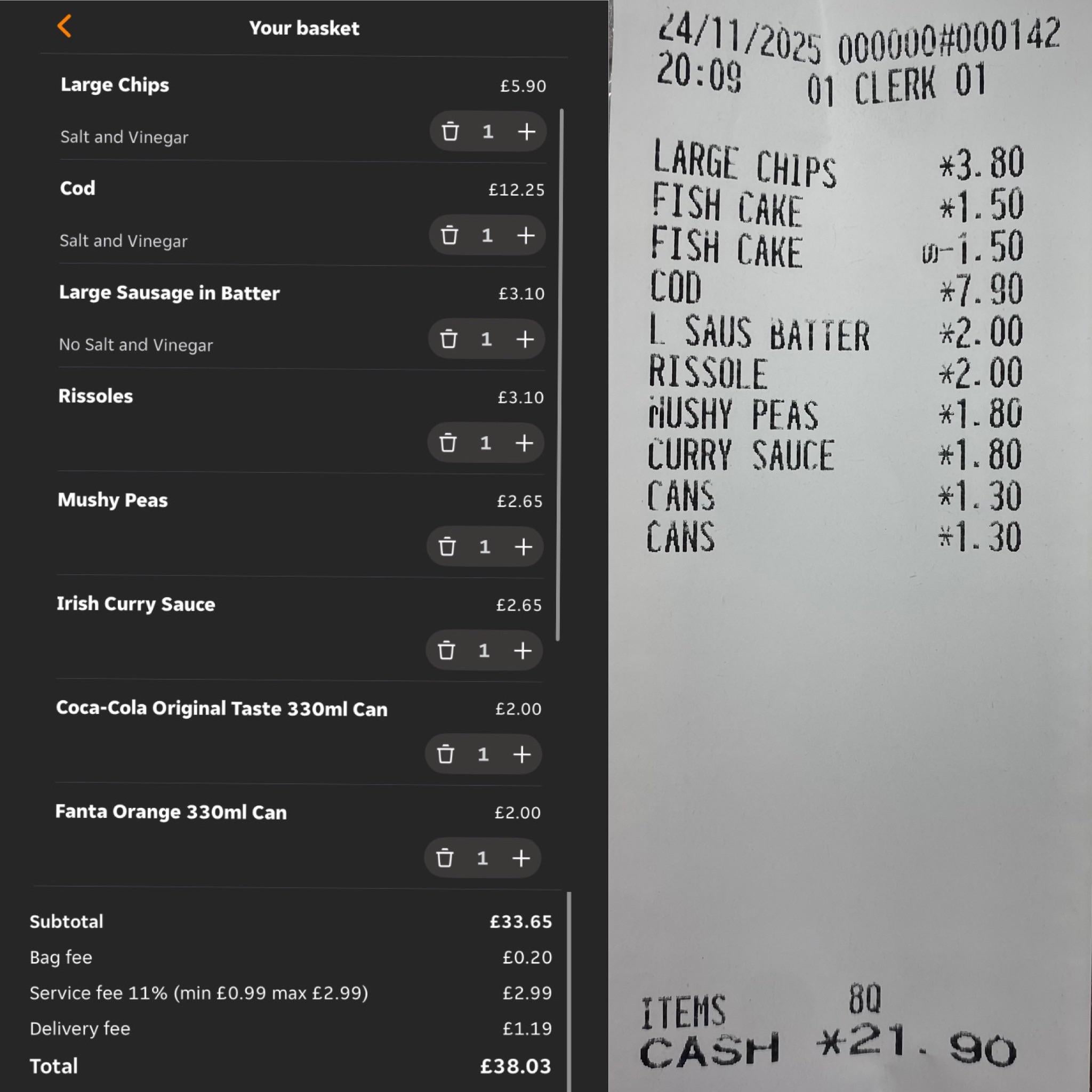 Exact same order from the same chip shop. The fish cake entry was added and removed, mistake by the bossman.