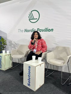 Susan Ann Samuel at the Nordic pavillion speaking about the role of youth in regional governance structures in Thiruvananthapuram, India.