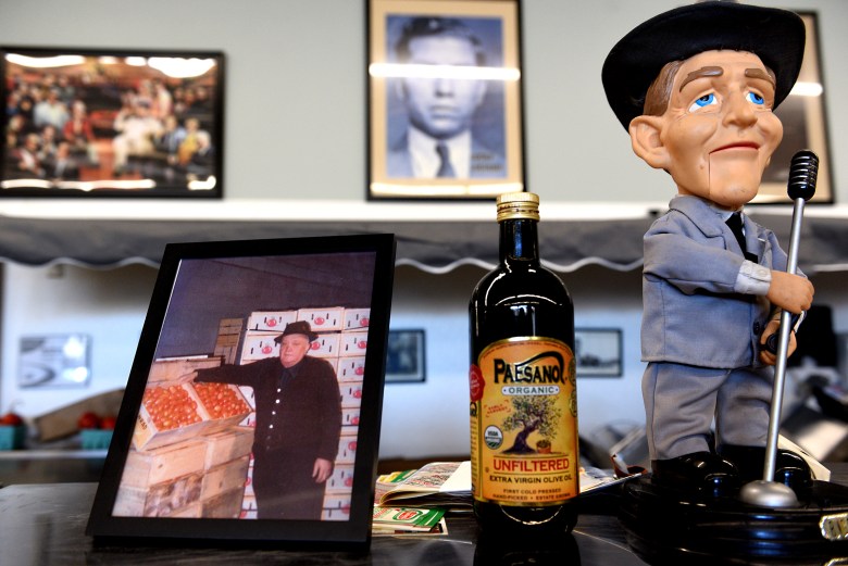 A photo of Anthony Pellegrino sits on the counter at Pellegrino’s Farmer’s Market and Italian Deli on Thursday, Nov. 20, 2025, in Lebanon, N.H. Pellegrino is the grandfather of Joey Pellegrino, the owner of the newly opened market. “He goes everywhere I go, he was my mentor,” said Joe Pellegrino, remarking that his grandfather made wine during prohibition in the North End of Boston, creating a customer base for the wine.