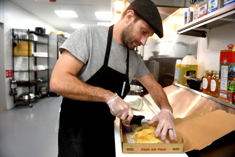 Matteo Buck prepares a sausage calzone for a customer at the newly opened Pellegrino’s Farmer’s Market and Italian Deli in Lebanon, N.H., on Thursday, Nov. 20, 205. The market makes its own dough using semolina flour. JENNIFER HAUCK / Valley News