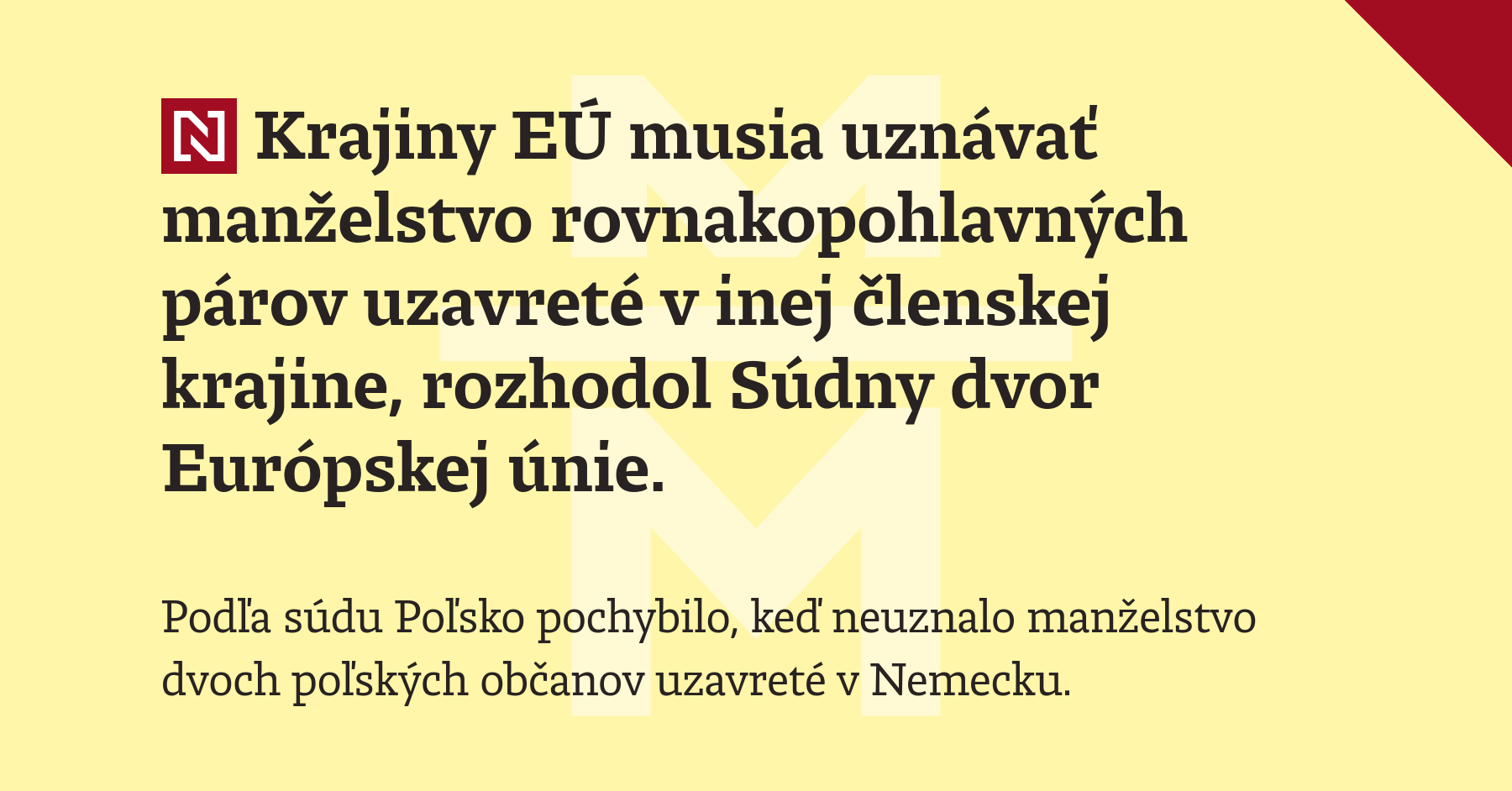 Teraz sa určite veľa napočúvame o súdnom aktivizme a diktáte EÚ, no mna toto rozhodnutie potešilo. Ak uznávame, že pred zákonom sme si všetci rovný, tak bez výhovoriek. Škoda, že nás k tomu ale musí dokopať externá entita a nedokázali sme si to schváliť sami.
