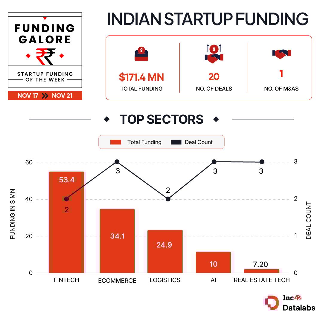 Between November 17 and November 21, twenty startups cumulatively raised $171.4 Mn, marking an over 5% uptick from the $162.9 Mn bagged by 22 startups in the previous week.
