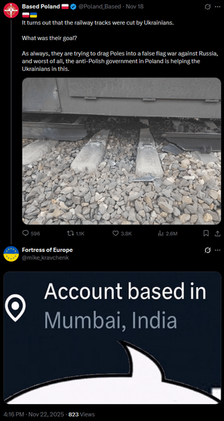 Why it even matters? Doesn’t matter if the sabotagers were Ukrainians, Belarusians, Poles or Martians. They were obviously paid by some intelligence agency, most likely by the ones that could earn the most out of it, which would be Russians in this case (costs that now Poland have to pay to secure XXX km of railways). X feature may give some idea about account but real bot farms will simply build their own VPN network to find other ways to overcome the problem.