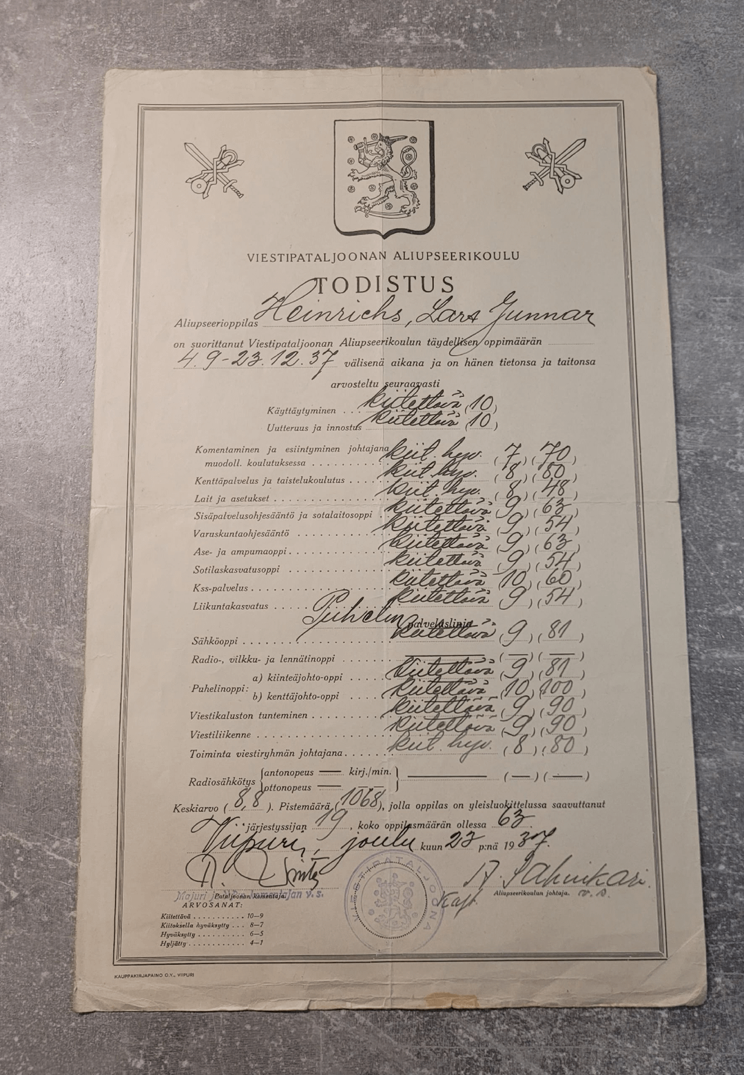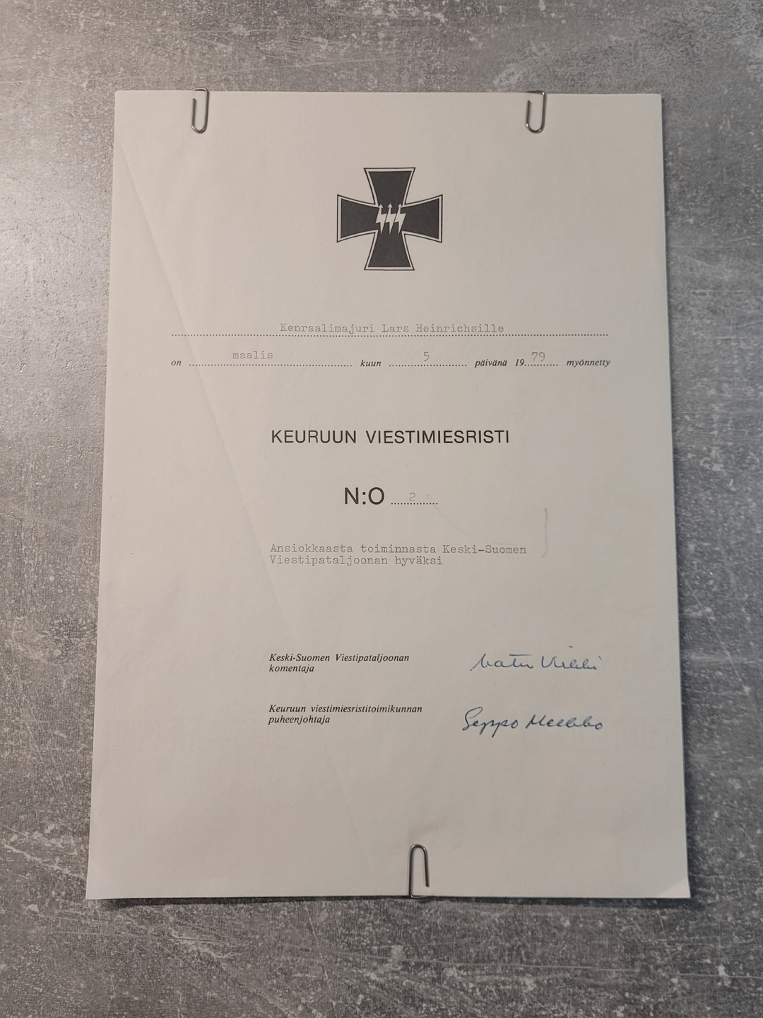 - Certificate of Honour, confirming the award of the Keuruu Signalman’s Cross to Major General Lars Heinrich for his meritorious and particularly distinguished service to the Central Finland Signal Battalion.