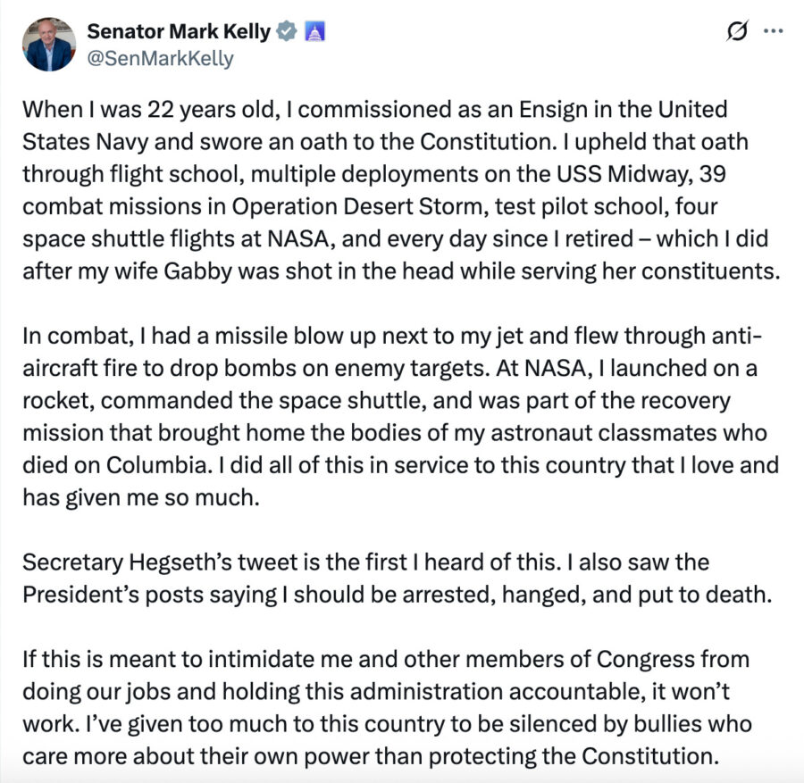 And make no mistake: The effect is not limited to Mark Kelly. The message is to every politician, veteran, and citizen who might dare lift their voice against the machinery of power.