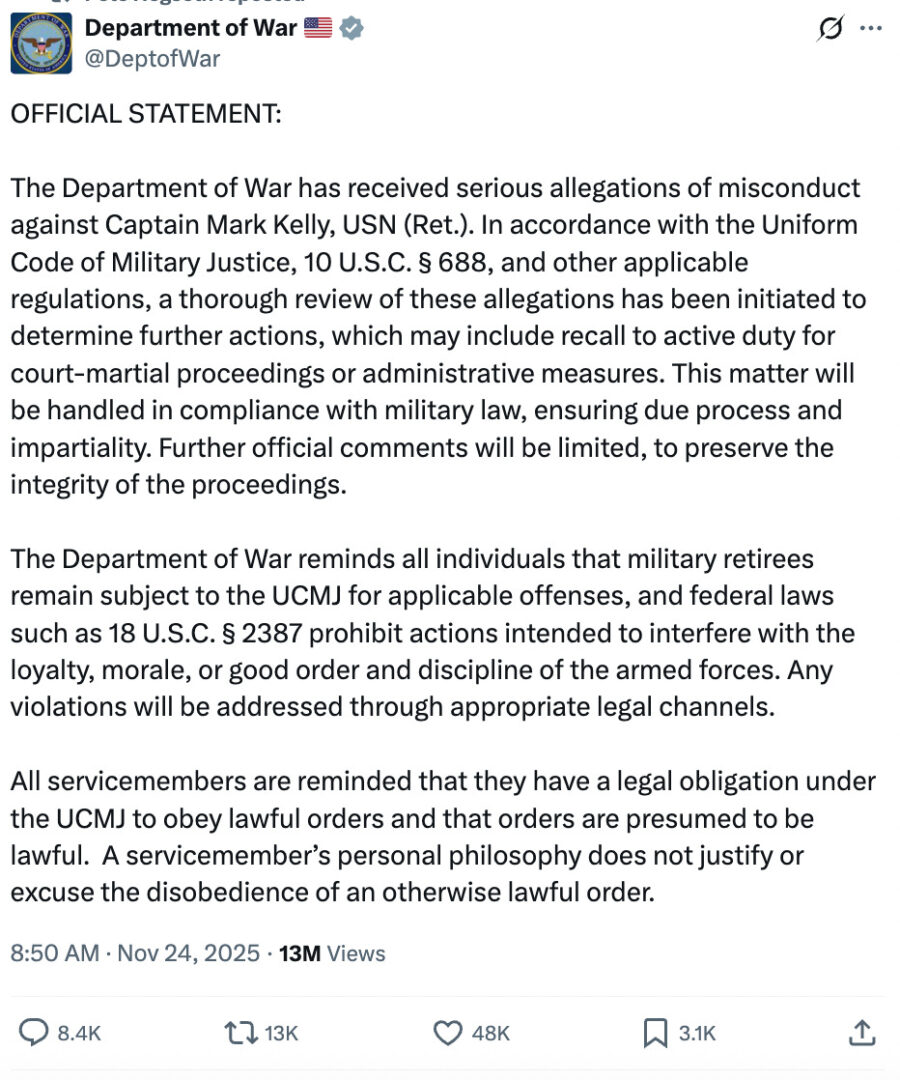 On November 24, 2025, the United States Department of Defense announced it was initiating a “thorough review” of Sen. Mark Kelly’s (D-AZ) conduct, citing “serious allegations of misconduct” under the Uniform Code of Military Justice (10 U.S.C. § 688) and federal law (18 U.S.C. § 2387) regarding interference with the loyalty, morale or good order of the armed forces.