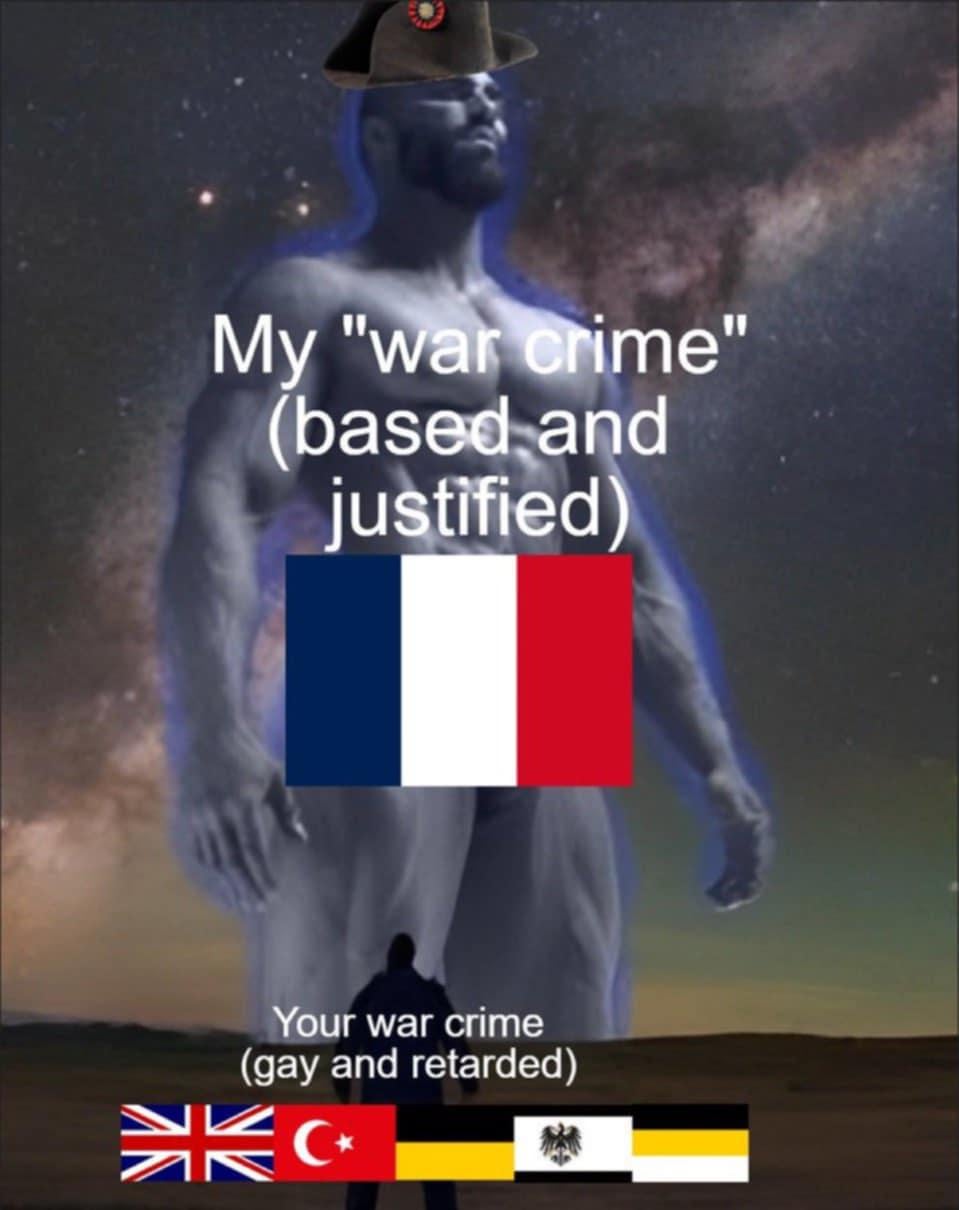 "France killed 30 millions people !" Russians and Algerians don't count. by Llanistarade Tags:2 Western Europe 4u2WesternEurope4uEurope 20 comments What’s wrong with being gay? https://i.redd.it/q49fwywcyk3g1.gif Most humble frog: It’s not “your” warcrime, but ours. We all participated. Leave some for others, selfish. Pierre calling someone else gay…what’s next? Hans calling someone a pervert? >”France killed 30 millions people !” Russians and Algerians don’t count. Holy based. I’d like to argue with you, but you have won this argument irrefutably; by portraying yourself as the based chad and us as the gay and restarted one. Pff, I’ll see your Algeria and raise you a Kenya! We are terrible people… Didn’t napoleon kill Turkish POWs? We killed millions of Russians ? TF so based ! J’adore ce slip, je veux le même. google en war crime Canada come along, shoot the chad and says what war crimes. Algerians love whining about what they call “algerian genocide” Well why are they that much then? (we still did absolutely abhorrent shit there) I understand their thinking with a language like that. Sweden has luckilly never had a War Crime. a bit unrelated but reminded me of [this](https://youtube.com/shorts/XsfBaLHM7hw?si=e4F0ItDT-erd8hH7) I don’t object to this post, I do however object to being compared to the Turkish. Goos thing we never comited any warcrimes 😇 Note how the “gay and retarded” war crimes are only for Austria-Hungary and Prussia, but not for either of the two big troublesome Germany’s… Comments are closed.