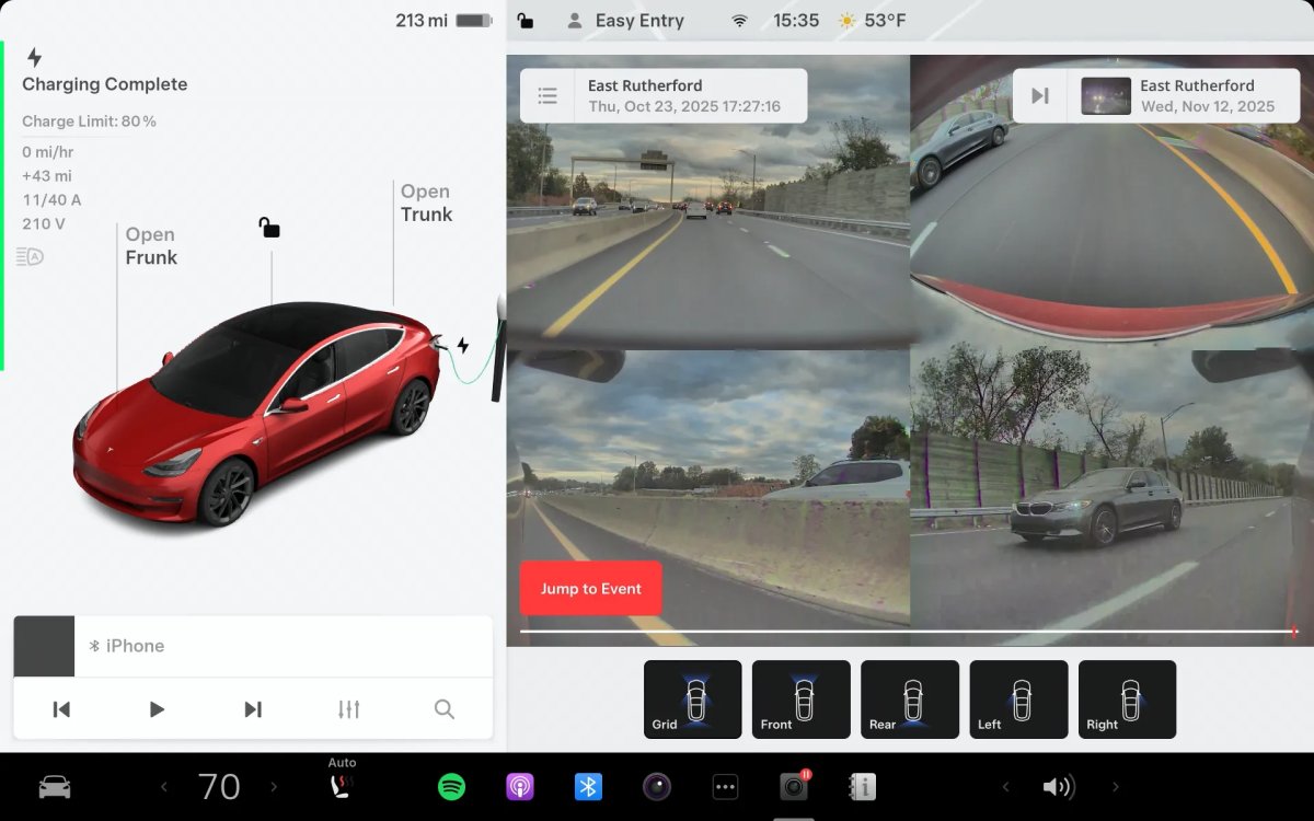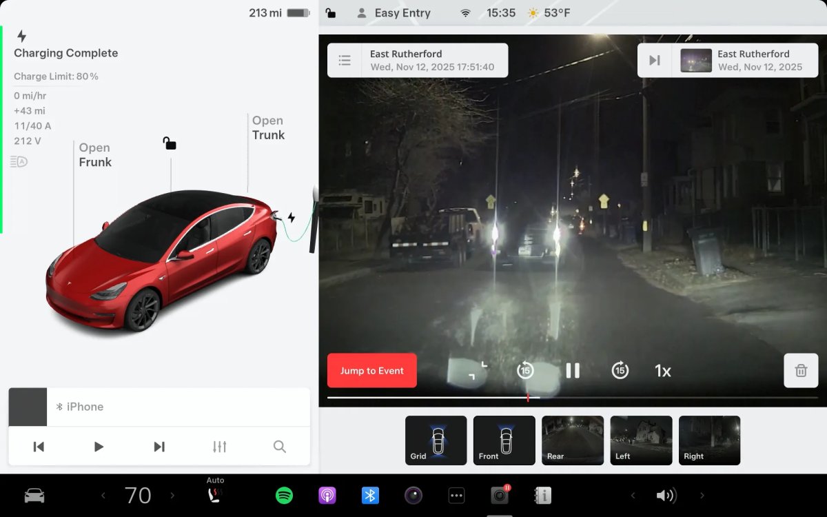 However, this isn’t just an improved UI. It also includes additional features. The scrubber bar now includes the Jump to Event button, which immediately brings you to the event that triggered the Dashcam to save the video – whether it be a Sentry event or a horn honk. You can also now jump forwards and backwards in 15-second increments using the dedicated on-screen buttons, replacing the clumsy manual scrubbing of the past.