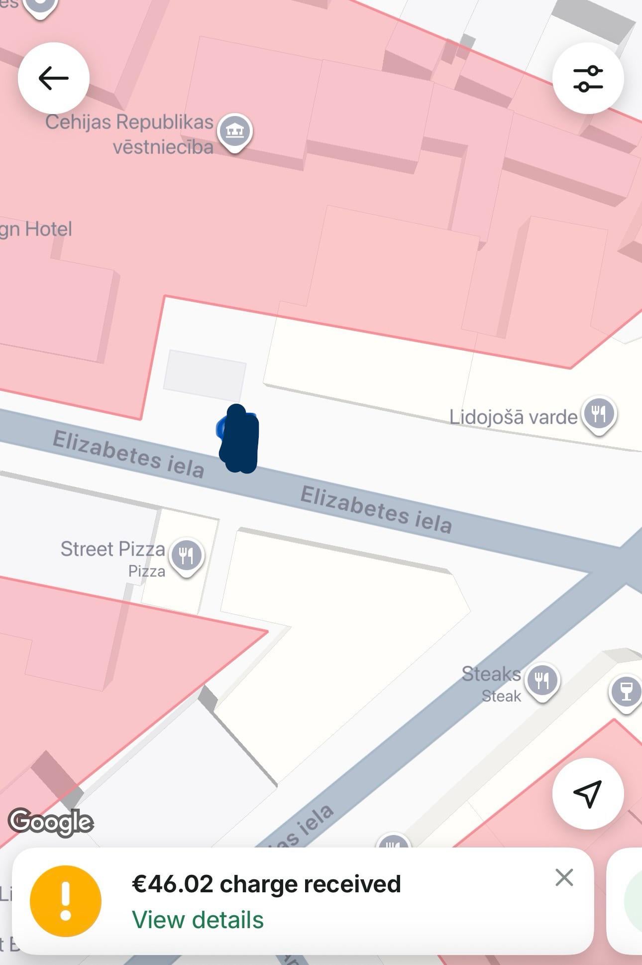 Noparkojos vēstniecības stāvvietā – atzīmēts bildē, pēc app izskatījās, ka tur jau sākas B zona un var parkoties, bet nekā.