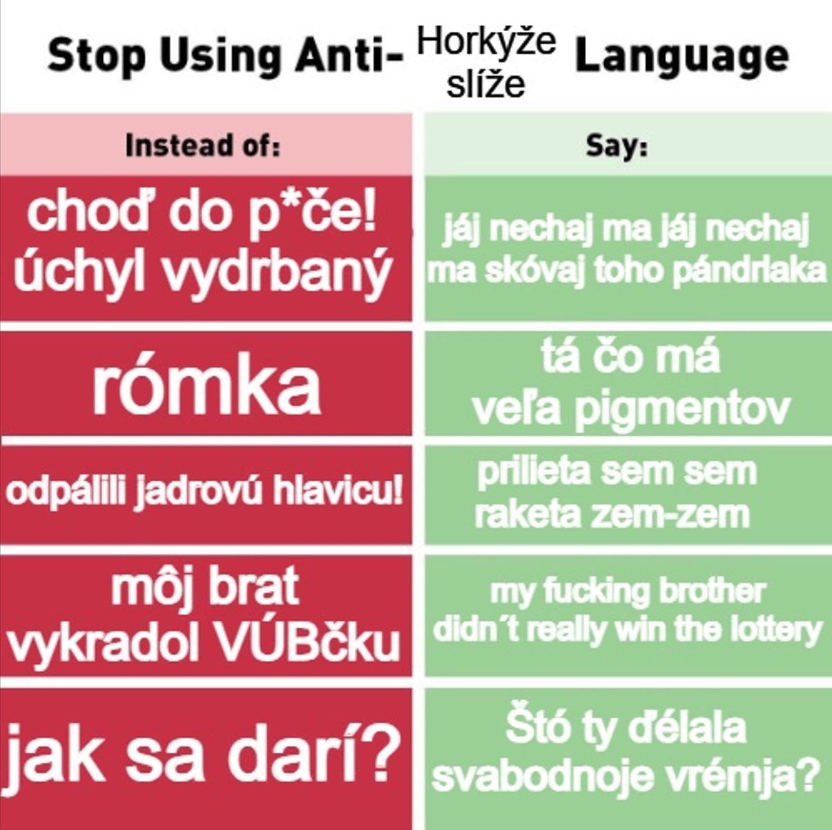 Stop using anti-Horkýže slíže language! by DzedzinCHAN Tags:slovakia 8 comments Je lenivý -> má piči na lehátku najlepsi post aky tu bol za poslednu dobu instead of “dobry den” say “ahahoj” instead of “prd” say “trapny vietor” instead of “we’re all living in america” say “rotavátorkrhlakýbel regálvidlyhrablerýl” post má 69 – nikto sa neopovážte to zmeniť Stop saying “I love eating p**sy”. Say: “Tam v dolných ženských partiách je veľkej slasti región” instead of “teplota vasho polnohospodarskeho pristavku presiahla standardne hodnoty” say “HORI TI MASTAL” Instead of “Besný pes dohrýzol občana” say “Bernardín mal apetít” Comments are closed.
