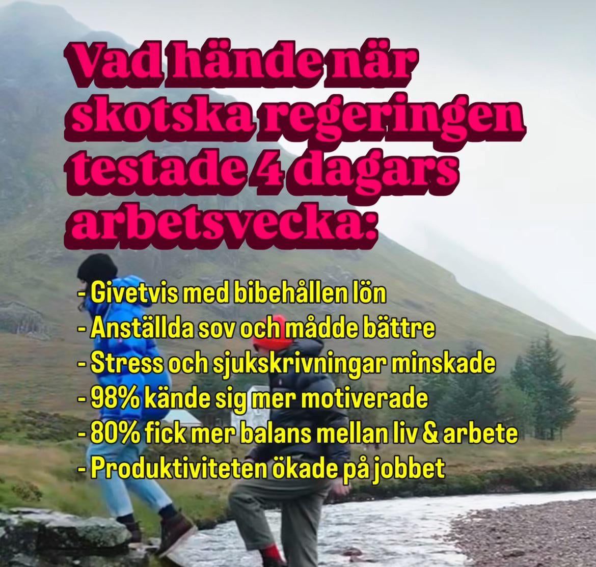 Oklart vart detta kommer ifrån? Jag är halvskottsk/halvsvensk. Bott och jobbat i Skottland i 5 år aldrig hört något företag som kör 4 dagars vecka. Det var en “meme” ett tag men ingen som faktiskt provat det.