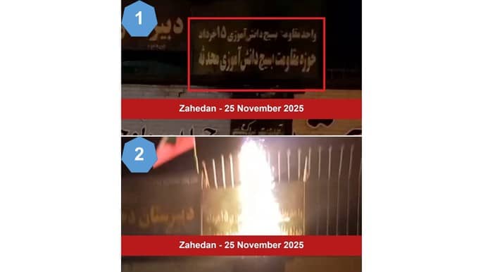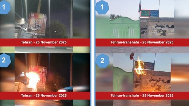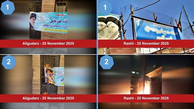 In these operations, four Basij bases of the IRGC in the cities of Zahedan, Iranshahr, Talesh, and Rasht were set on fire. Additionally, government banners with pictures of Khomeini and Khamenei were torched in Tehran, Aligudarz, and Hamedan.