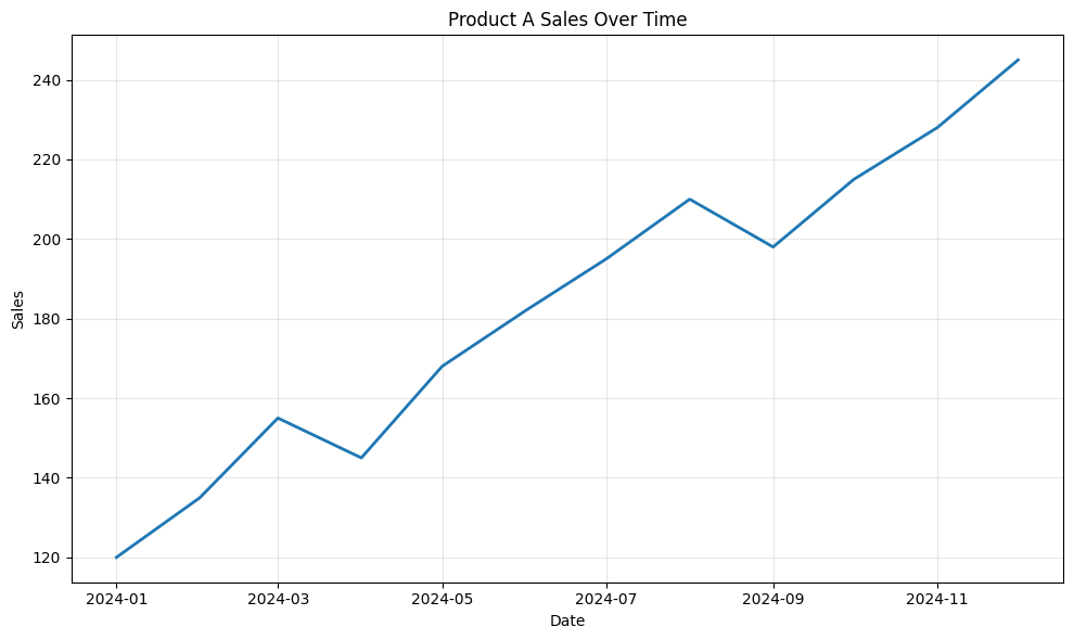 ax2.plot(df[‘Date’], df[‘Product A Sales’], label=’Product A’, linewidth=2)