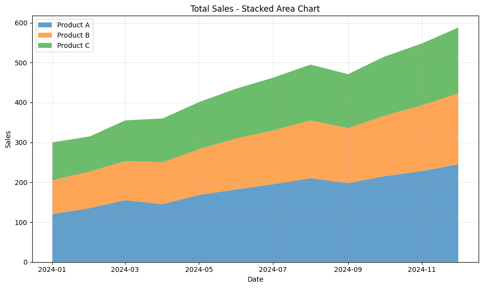 ax4.set_title(‘Total Sales – Stacked Area Chart’)