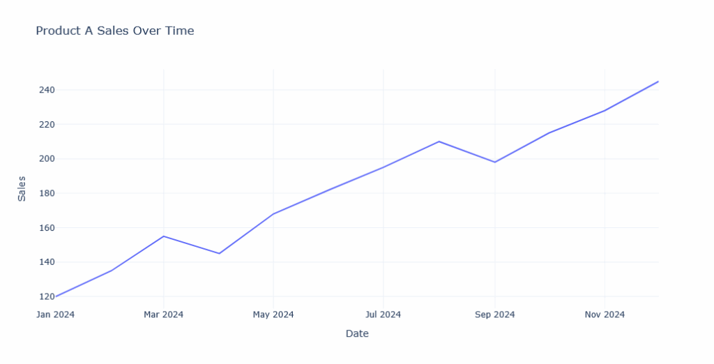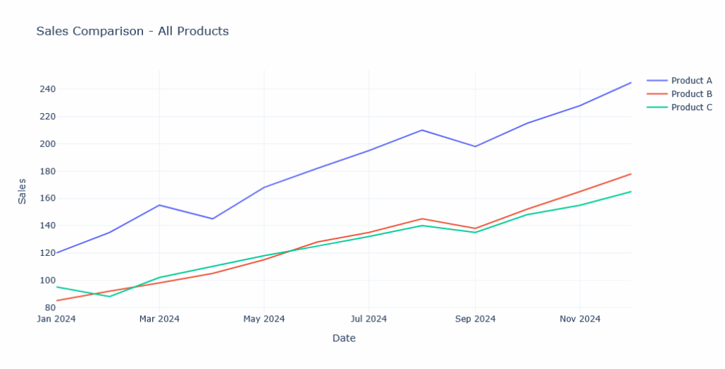 fig1.add_trace(go.Scatter(x=df[‘Date’], y=df[‘Product A Sales’], mode=’lines’, name=’Product A’))