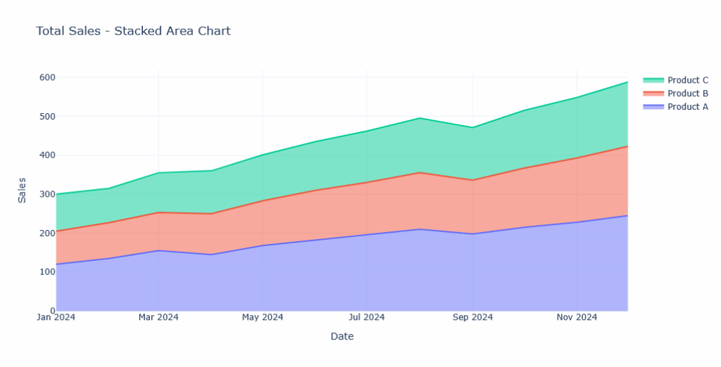 title=’Total Sales – Stacked Area Chart’,