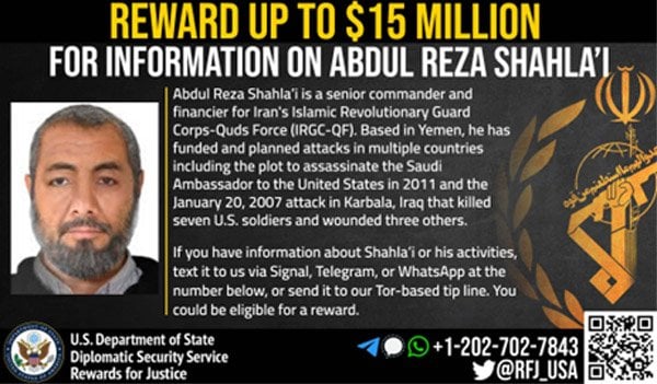 The United States is seeking information on Brigadier Abdolreza Shahlaei from the IRGC Qods Force (US Department of State)