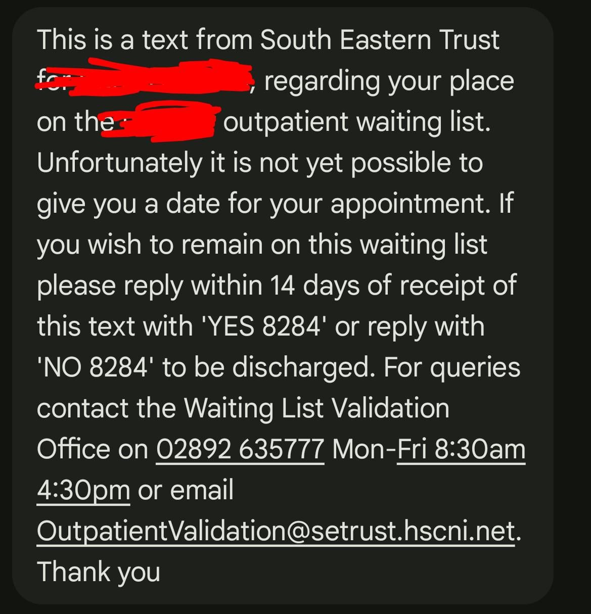 I forgot my mum was still the main point of contact on my medical records and she texted yes to 8284 rather than ‘yes 8284’ and that was me off the list, had to ring and beg them to put me back on it and basically restarted my 6 year wait, only got seen briefly because I thought I had a ruptured cyst and ended up in A&E and even then it was just to check to see if there was anything wrong with me rather than a proper appointment and once they determined I was ‘fine’ they sent me packing to A&E.