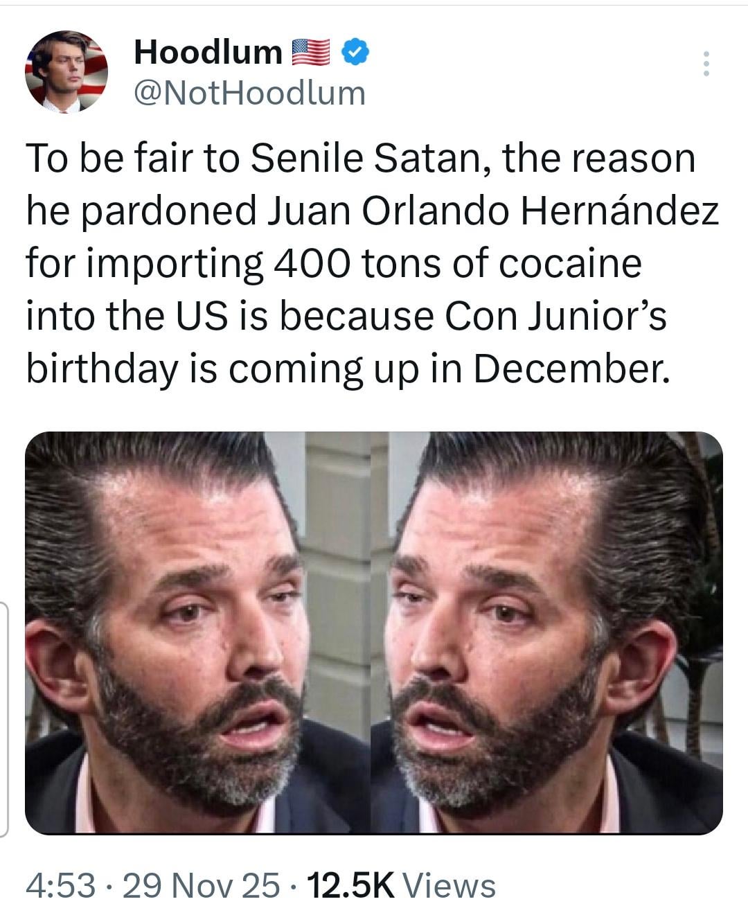 Everyone’s asking for PS5s and Xboxes for Christmas, but Don Jr.’s just out here collecting presidential pardons like Pokémon cards! Gotta pardon ’em all, right? 😂