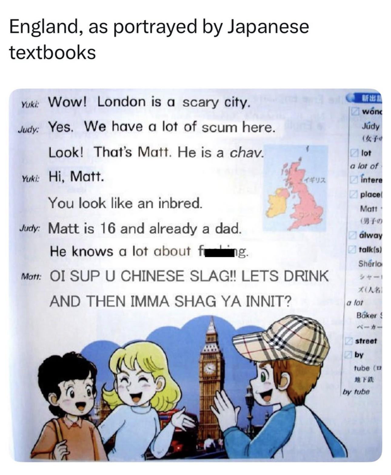 England as portrayed by a Japanese textbook, as portrayed by a 50 year old man making memes in Microsoft Paint badly to post on Facebook