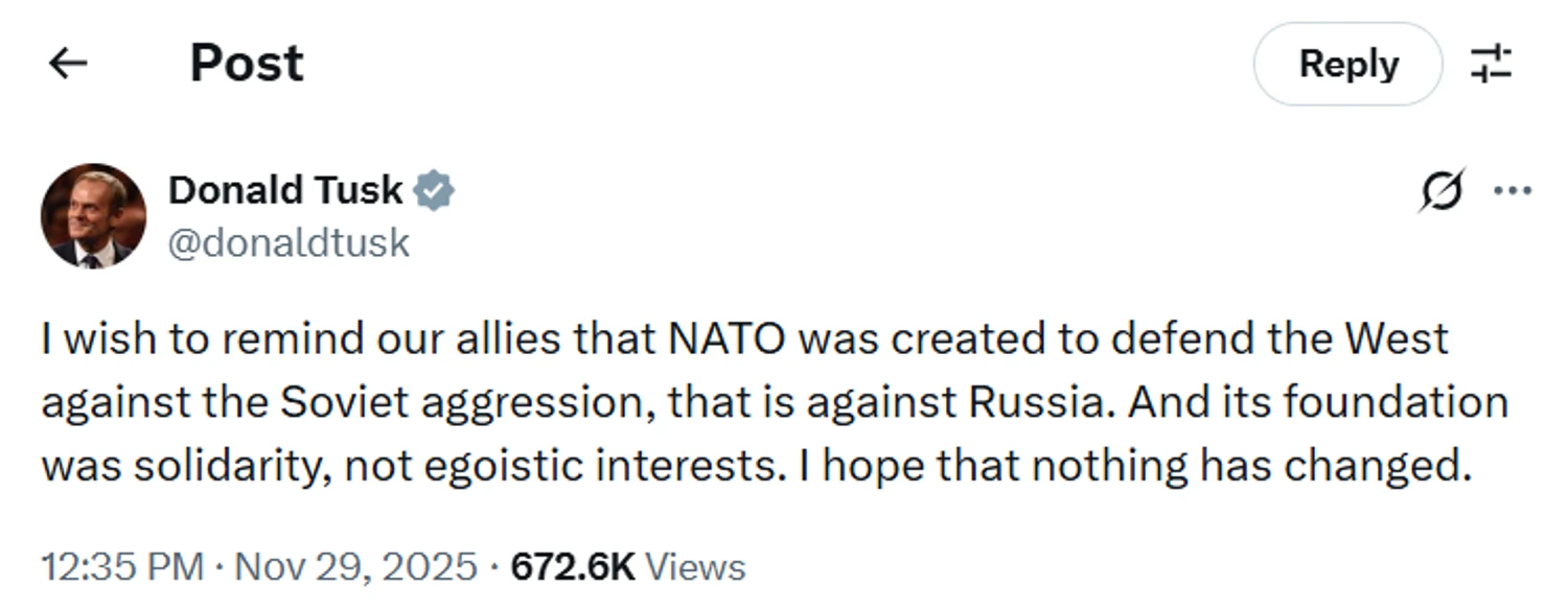 Polish Prime Minister Donald Tusk made a statement on the social network X regarding the policies of some NATO member states. This is reported by UNN.