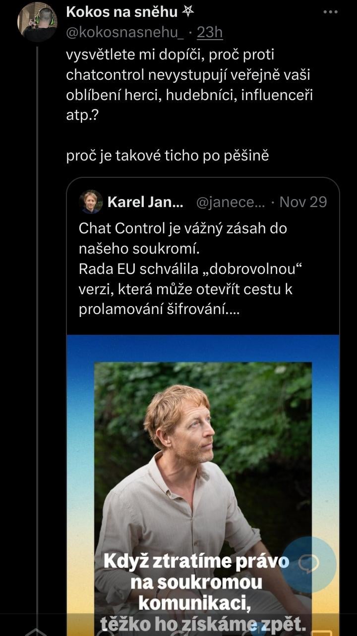 14. Protože je to nothingburger, už jsem to tu psal pod post několik dní zpátky. Go on, najdi mi v tom “Partial mandate for negotiations with the European Parliament” (tedy návrh o dojednání návrhu…) něco protidemokratickýho a protisoukroměkomunikačního. Jo, jasně, doporučují tam age verification a toho nejsem velký fanda (i když nemám úplně pevný názor). Ale nic z toho tam není nařízením, nýbržto tunou keců o voluntary activities těch dotčených poskytovatelů služeb a o zvýšení, prodloužení a organizaci podpory kterou tito poskytovatelé dostávají od unie co se týče nahlašování cleartextového nelegálního obsahu. Už jsem tady psal, dětské porno můžu dál torrentovat