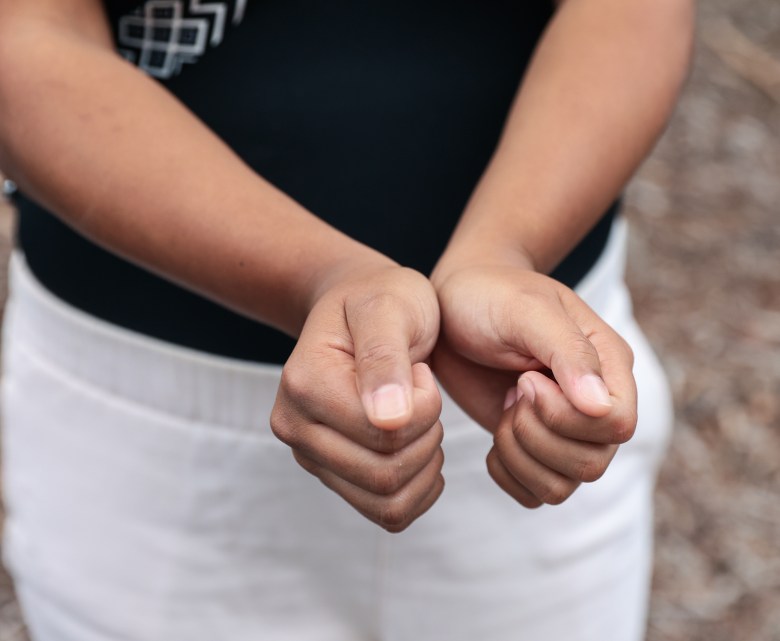 A Venezuelan asylum seeker in San Diego in November. She shows how her hands were cuffed while she was in immigration detention. (Photo by Adrian Childress/Times of San Diego)