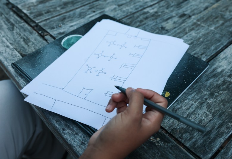 A Venezuelan asylum-seeker in San Diego draws a diagram of the open cells in the detention center where she was held. Many of the migrants in detention have no attorney and are left to navigate complex legal cases by themselves. (Photo by Adrian Childress/Times of San Diego)